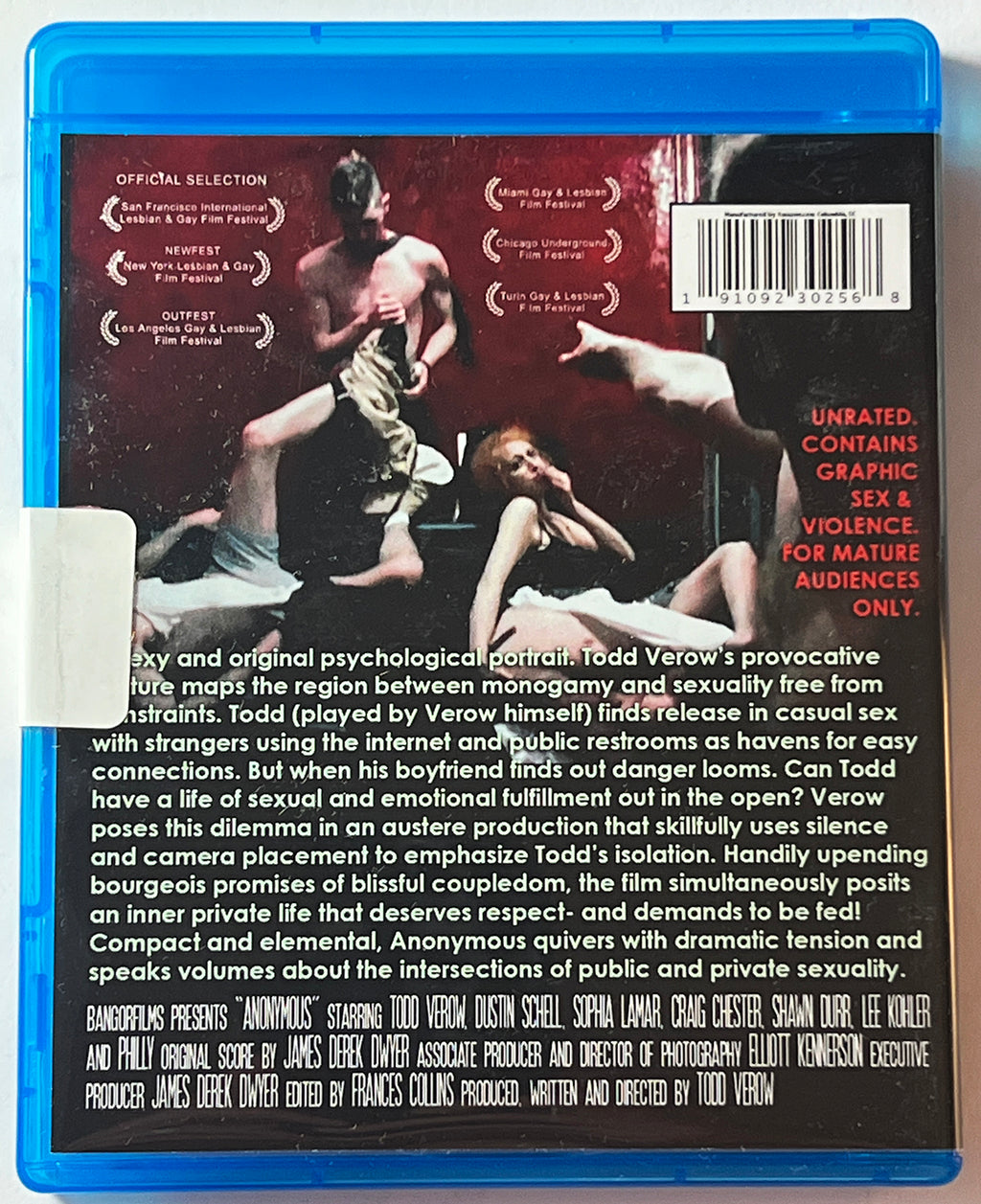 Out of print Blu-Ray of ANONYMOUS by New Queer Cinema filmmaker Todd Verow. Each signed by the director. ANONYMOUS: "A sexy and original psychological portrait, Todd Verow’s provocative feature maps the region between monogamy and sexuality free of constraints. It’s a precarious zone, especially when happiness is assumed to be lurking behind the scenes." 83 minutes. Not rated contains nudity, graphic sex and violence.