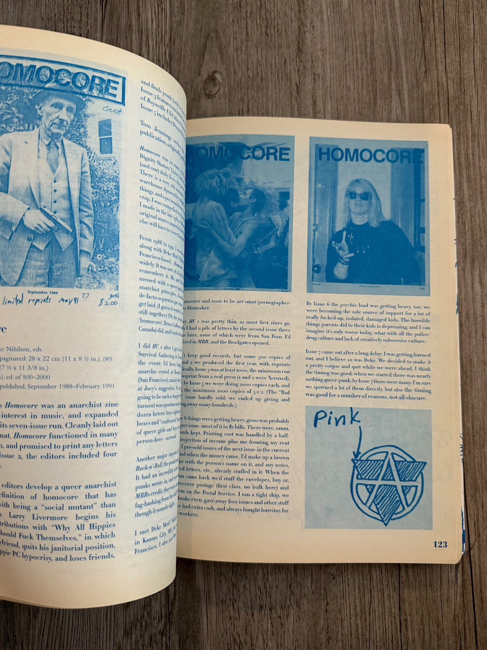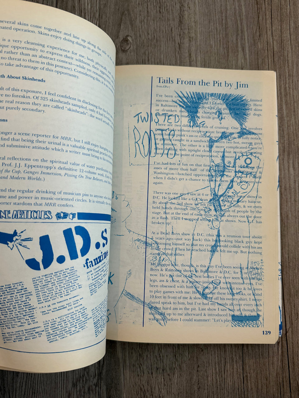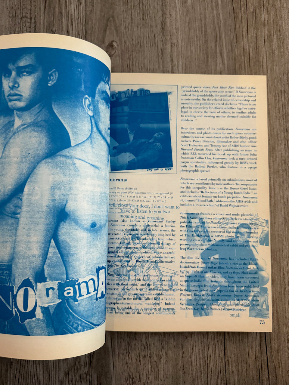 Queer Zines, the catalogue, collects the variegated practices of zine makers past and present, from North America and Europe, and lists them alphabetically, starting with Toronto’s 88 Chins and ending with the Dean Sameshima zine Young Men at Play. In a riotous assemblage of more than 200 pages, we find comprehensive bibliographies and sinful synopses for more than 120 zines by Alex Gartenfeld, excerpted illustrations and writings by zine makers, reprints of important articles in and about queer zines, a directory of important zine archives, and a list of zine outlets around the world. It also includes a 1980 interview with Boyd McDonald by Vince Aletti, Bimbox’s pop-up genitalia (alas, not popping up here), Adam Block’s early writings on zines from the Advocate, a “Where are They Now?” section that charts the careers of various queer zine pioneers, and excerpted interviews with GB Jones, Vaginal Davis, and Bruce LaBruce.