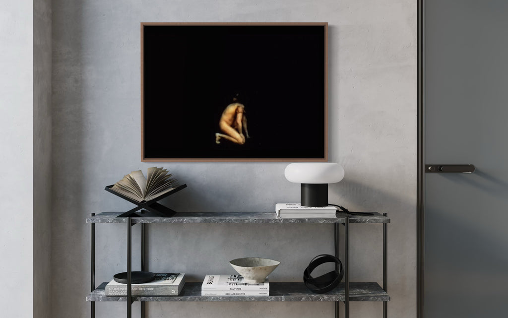 This print is a reproduction in an archival digital format and depicts the nude figure kneeling on the floor as the suited figure bends over him and bites his back.