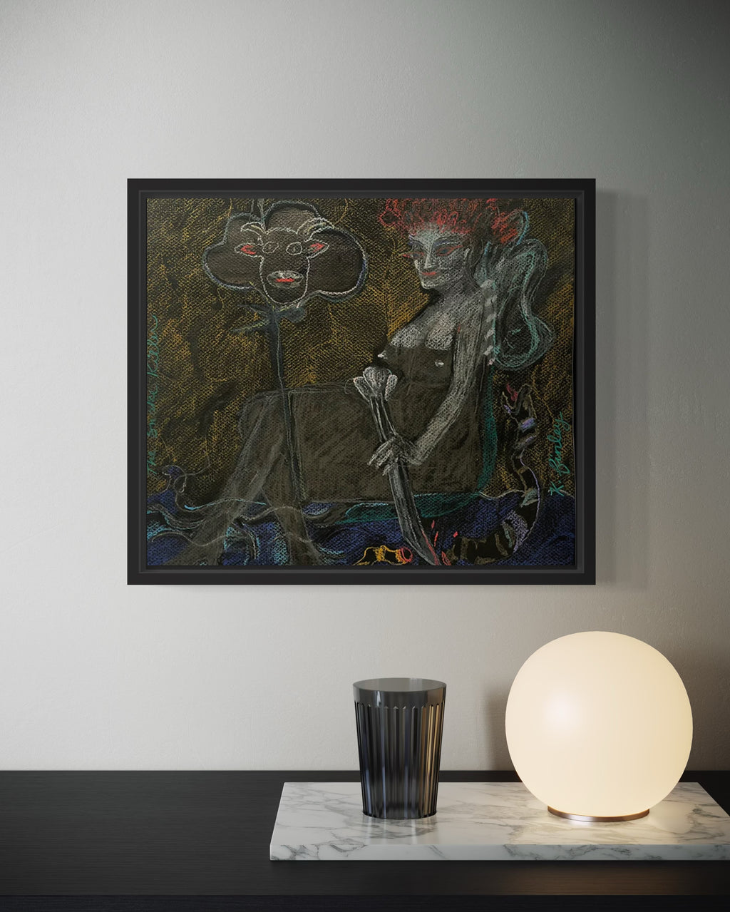 Karen Finley (American 1956-) “The Snake Killer”, unframed original in pastel & colored pencil on black Canson Mi-Teintes paper. Minor crimping upper left and right edges. Slight tear (1/2”) bottom left. Signed and titled right and left margins on front by the artist. Dated 1989 and signed by the artist on reverse.
