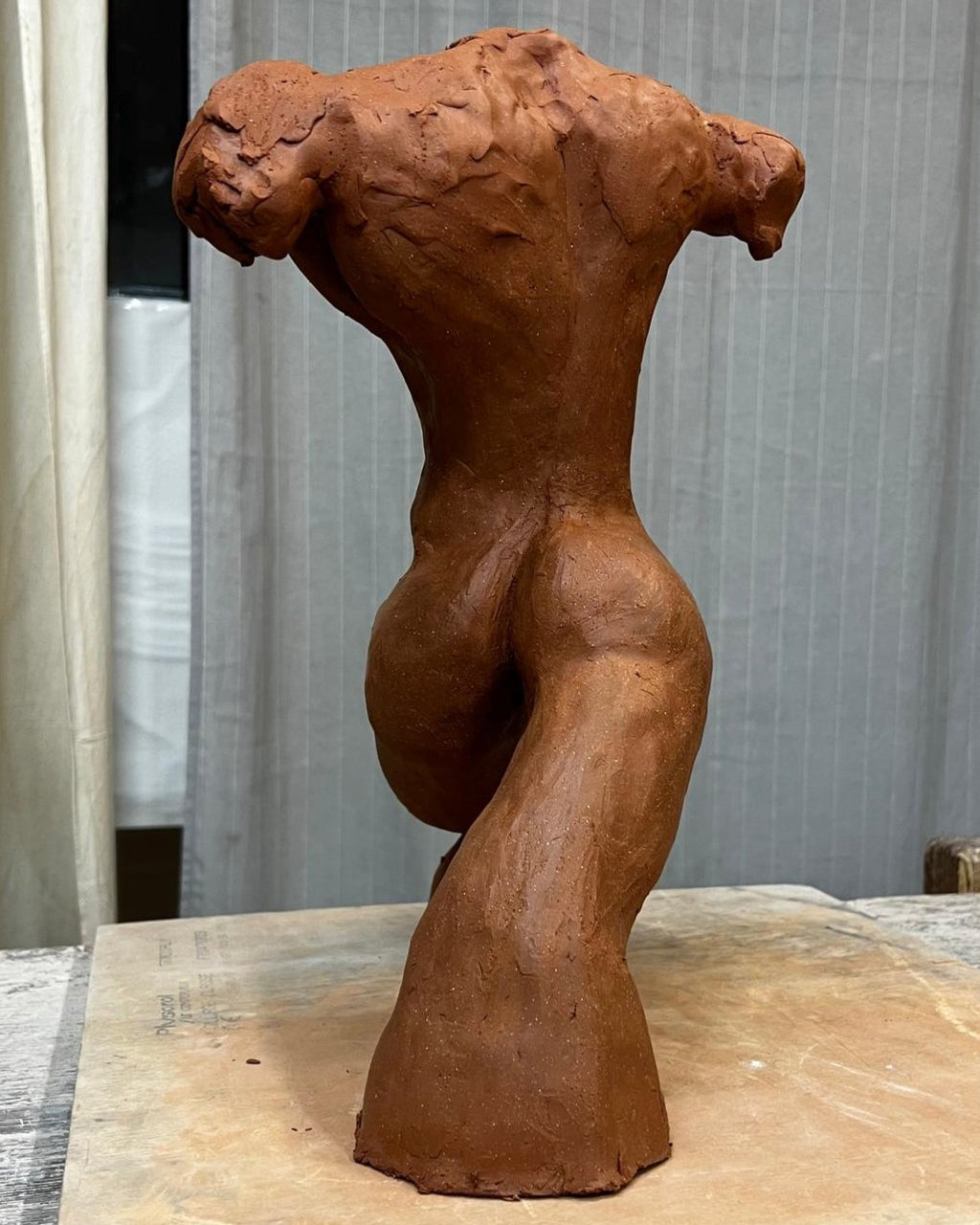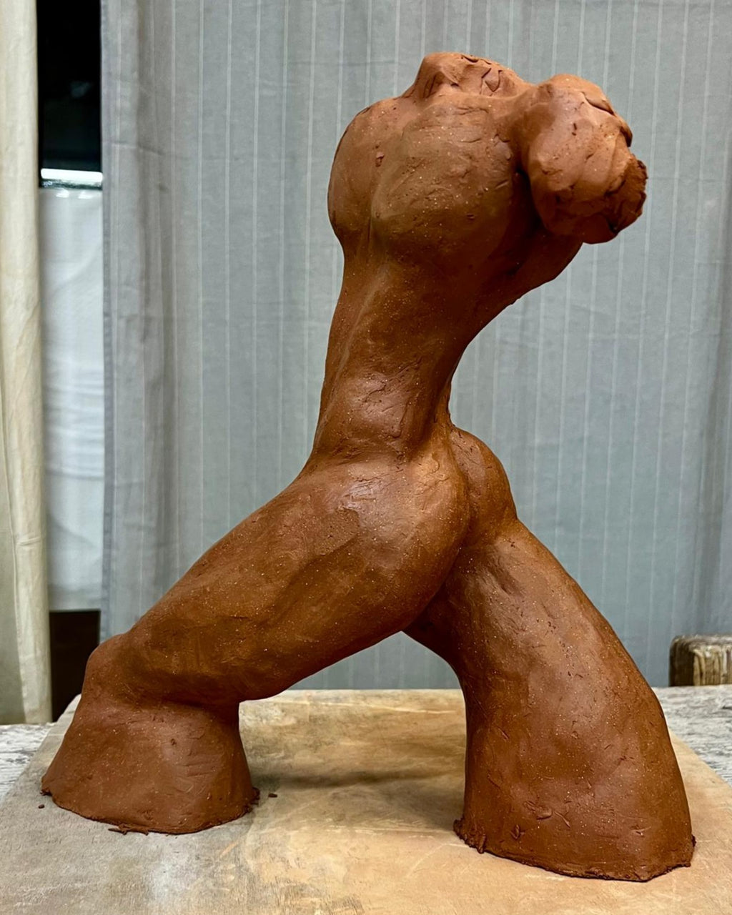 The finished work will be signed and accompanied by a Certificate of Authenticity and a short note documenting the transition from wet clay to fired form. Made as a return to studio practice after years of institutional work, the sculpture treats clay as gravity and risk: a material that remembers pressure, fatigue, and adjustment. Influences draw from classical sculpture language (Rodin, Maillol, Brancusi, Moore) while redirecting it toward contemporary, gender-interrogative bodies in motion.