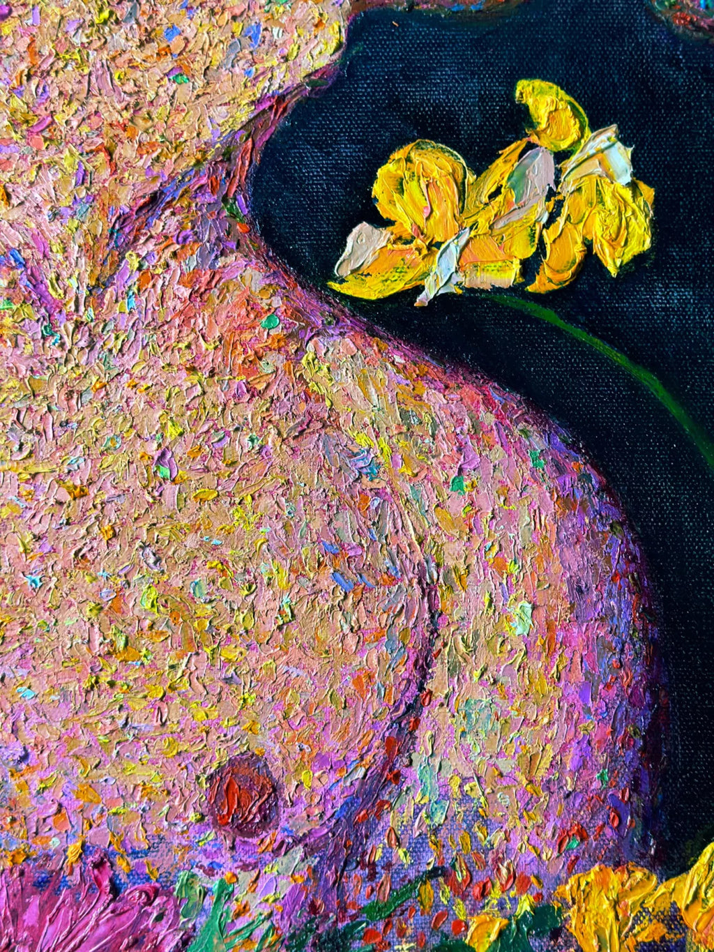 Maxim Bondarenko is a Russian artist based in Sacramento, California. He was born in Soviet Union, and lived in Moscow before the country’s political climate turned increasingly repressive towards gay people. Max relocated to the U.S., where he rediscovered his creative inspiration. During his time in America, he had few collective exhibitions and one solo show in Sacramento in 2022. Maxim’s work is rooted in academic art traditions and Impressionism, with a deep focus on color. He views color theory almost like a religion—it’s central to his practice and the lens through which he approaches every piece, seeing evidence of the Transcendental in it. He is fascinated by the clashes between warm and cool values and the dynamic tension of complementary colors, which he believes hold a unique, almost spiritual power. In his love of paradoxes, he often commits to pointillistic analysis of ephemeral optical illusions applied to the male physique, contrasting this with the viscous, bright, and vivacious impasto qualities of his flowers - two favorite subjects. While his art celebrates the beauty and sensuality of color, he also invites the viewer to pause and reflect “between pixels.” He hopes his work offers not just a visual escape, but also a subtle commentary on reality and a resistance to conformity.