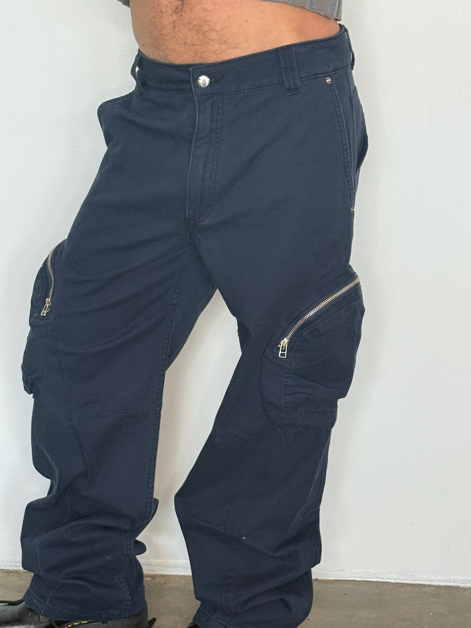 Low-rise with a straight leg, crafted from 9oz Japanese denim. Features utility detailing throughout, including cargo pockets with metal zippers. Finished with a circular patch at the back and signature EL pockets.
