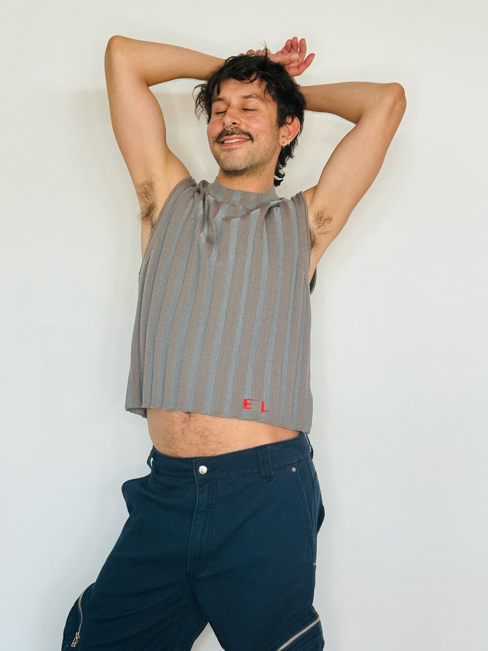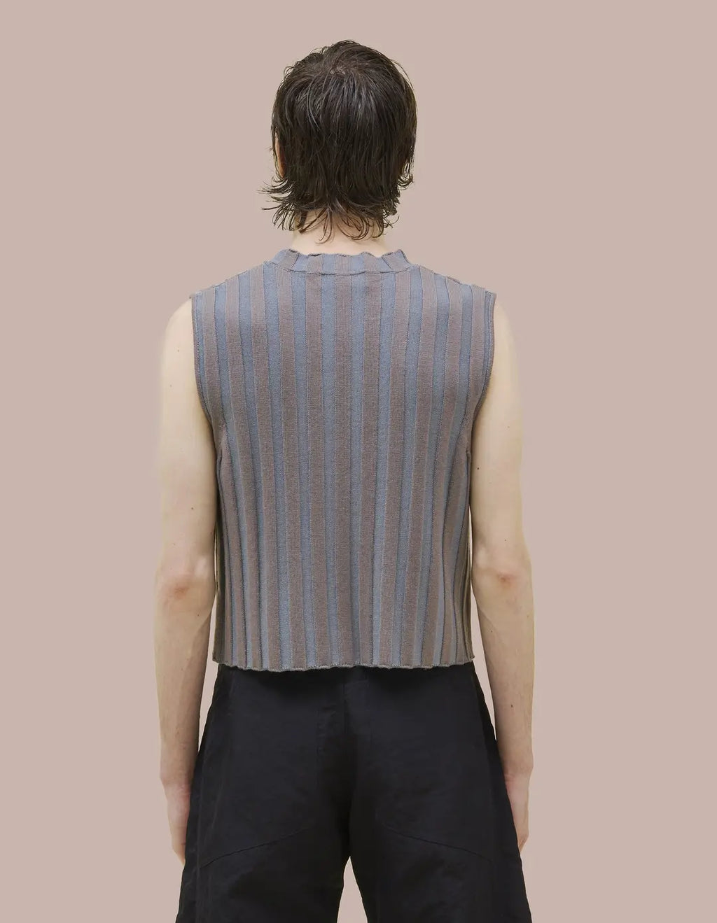 Classic boxy crewneck vest in 100% merino wool with a contrast striped wide rib. Features our new intarsia knit EL logo in red.