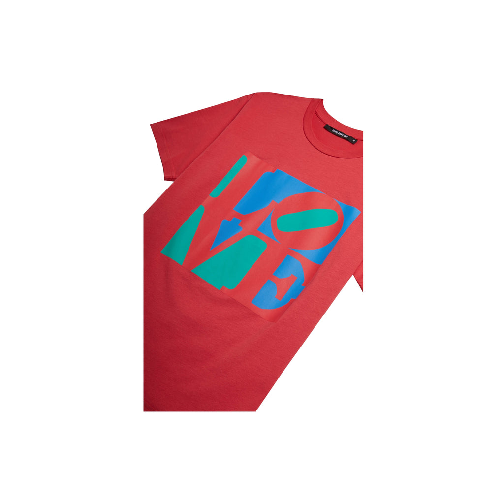 One of the best-known artworks in the world, Robert Indiana’s LOVE is printed on this soft blue t-shirt true to the artist’s vibrant color palette. “Robert Indiana” is printed in white as if stenciled on the left sleeve. 100% combed cotton jersey in blue.