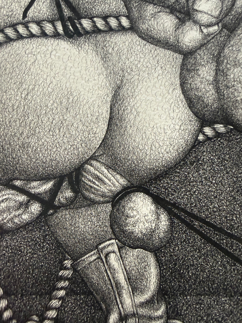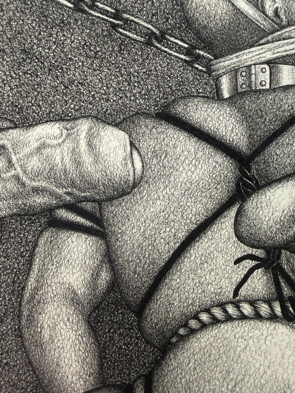 Nigel Kent (b. 1933, Australia) studied art in Sydney before moving to London in 1959. An early participant in the city’s underground leather scene, he later relocated to Amsterdam in 1973, where he embraced the emerging S/M culture and began producing homoerotic drawings. Working first under the pseudonym James D., Kent exhibited alongside Tom of Finland at the RoB Gallery, an encounter that helped inspire his shift from sculpture to drawing. Over the following decade he created a substantial body of erotic works—portraits of leathermen, postcards, and his distinctive “still life” studies of the male body—shown across Europe and the United States and published in magazines such as Drummer and Mr. S/M. Kent later moved to Antwerp in 1990 to pursue Constructivist work before returning to Amsterdam in 1993, where he continued drawing and published the book Der Mann in Kunst (1994). Also a writer under the name Dik Staal, Kent describes his drawings as erotic works meant to engage the viewer’s imagination, reflecting decades of personal experience within leather culture.