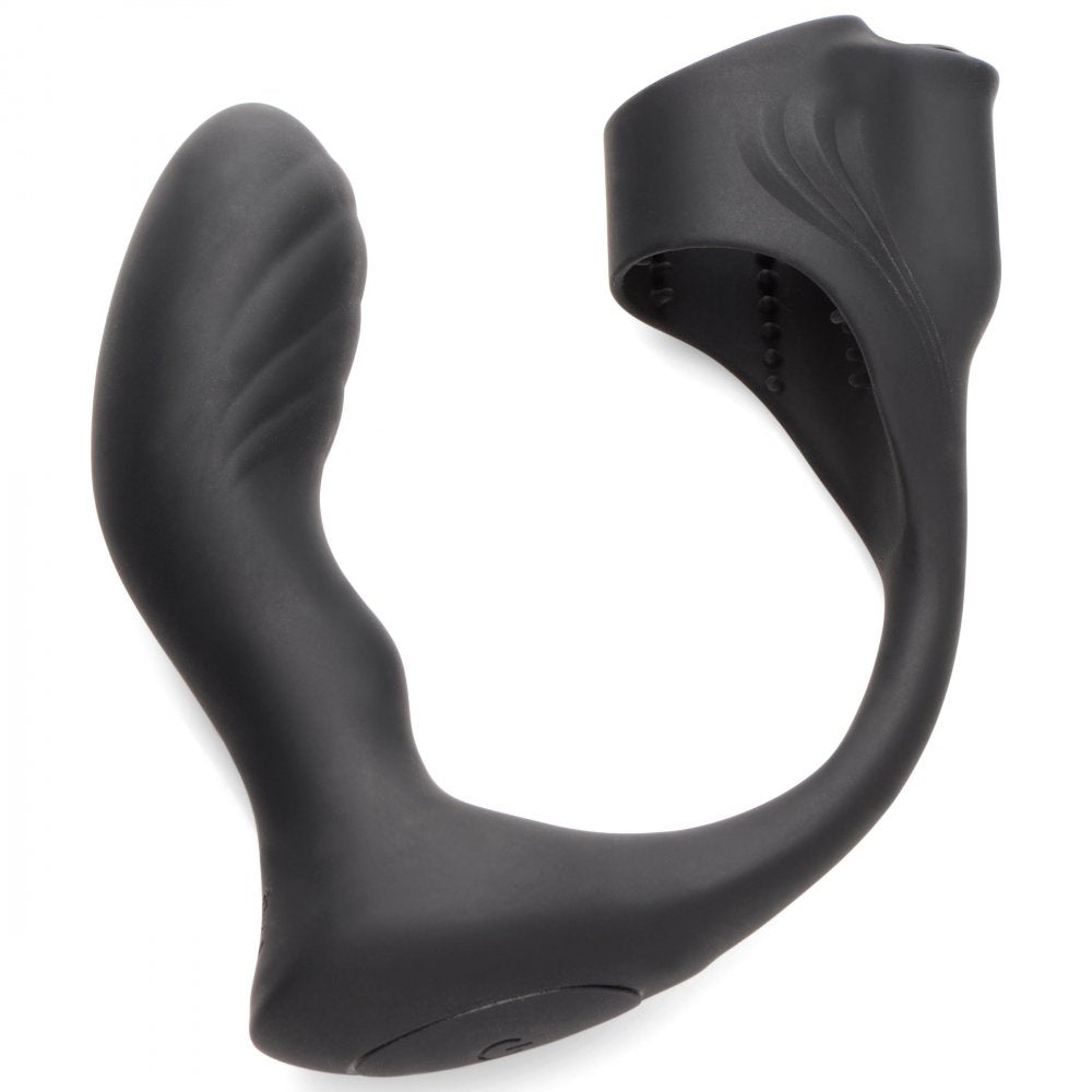 Combine cock and ball pleasure with prostate stimulation with this powerful, vibrating plug! The curved, angled plug is designed to press directly onto your prostate and stimulate it. Connected to the plug is a wide ring that wraps your member in a short sheath with textured nubs on the inside. As you enjoy the squeeze from the constriction ring, one of the two powerful motors is anchored to the sheath so you get powerful vibes directly to your dong! The other motor is sending buzzing sensations to your backdoor via the prostate plug. Choose between 3 speeds and 4 patterns of powerful vibes that you or your partner control with the battery operated remote. Enjoy playing and exploring different dynamics and games with a remote that reaches up to 26 feet! Made of premium silicone, it is soft, stretchy, durable and phthalate-free for body-safe fun.