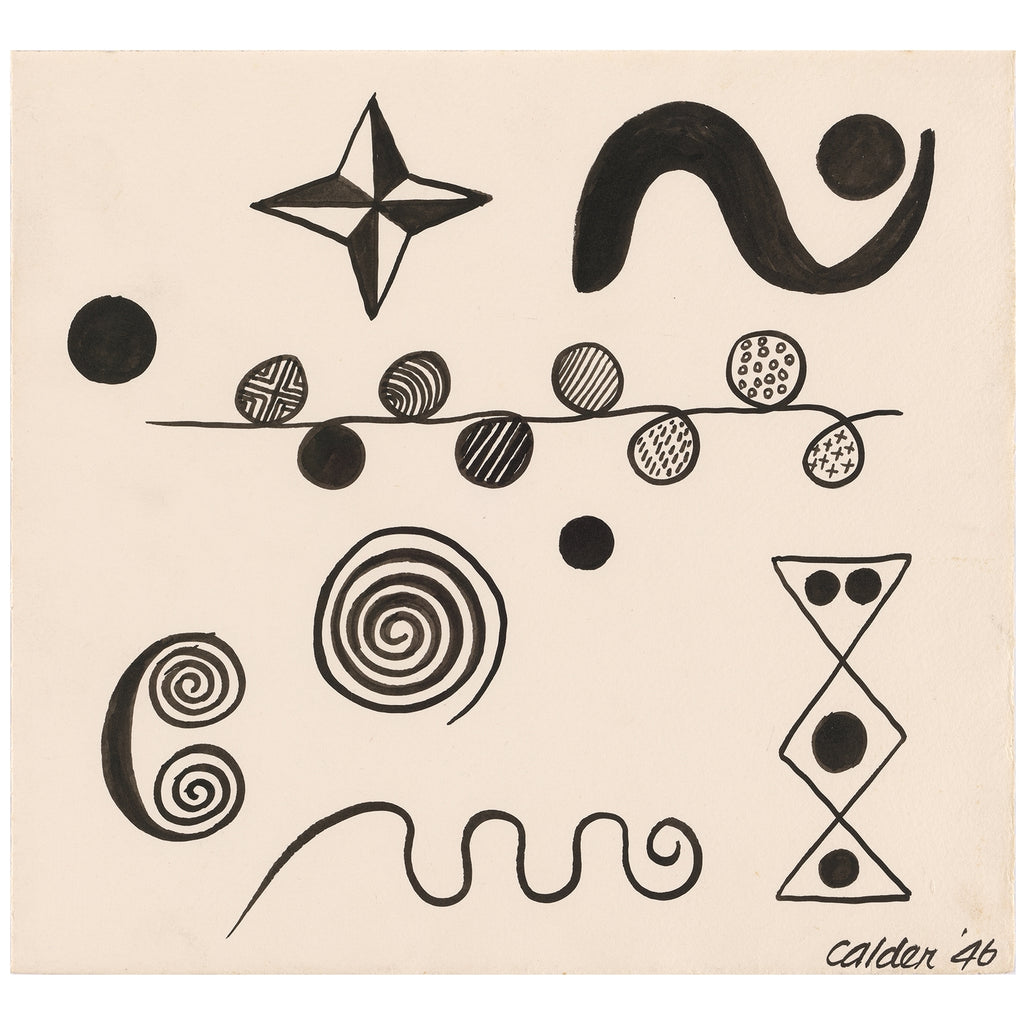 While celebrated as a sculptor, Calder also created a diverse range of paintings and drawings. Even when working in two dimensions, he intuitively conveyed a sense of motion in his compositions, as seen in the sinuous, spiraling, and radiating shapes in this ink drawing from 1946.