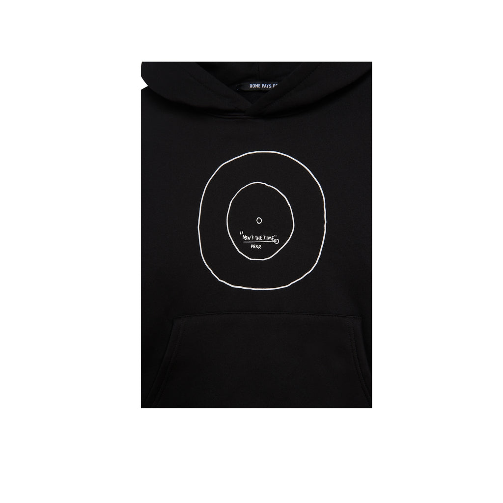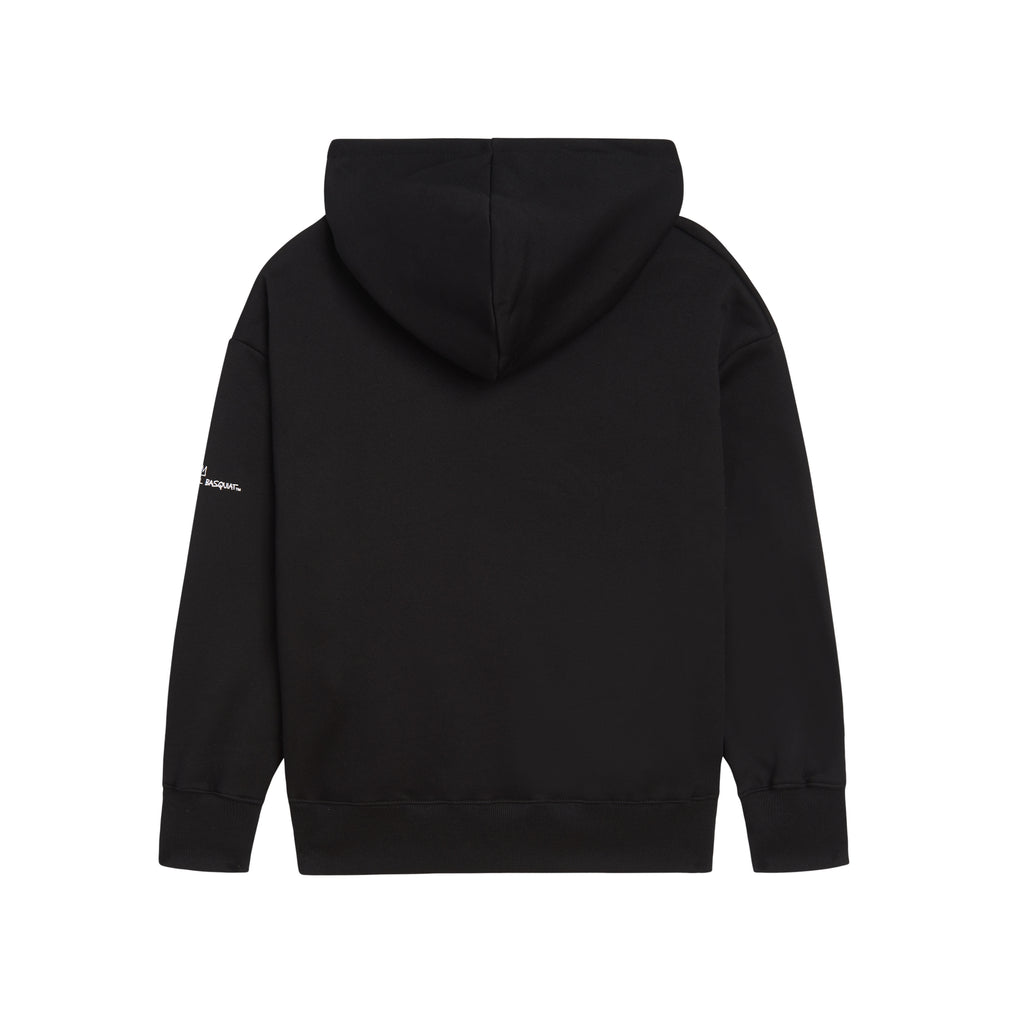 This medium weight fleece hoodie features Basquiat’s artwork Now’s the Time printed across the center front of the black hoodie. The hoodie also features a kangaroo pocket at the front.
