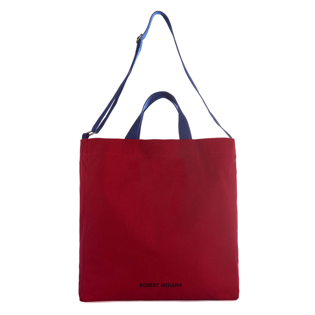 Our oversized, heavyweight duck canvas tote bag features Robert Indiana’s beloved LOVE on one side. The red bag features two types of contrasting blue straps: an adjustable long strap to wear as a cross body, and shorter hand straps. Fully lined with a large, zippered interior pocket.