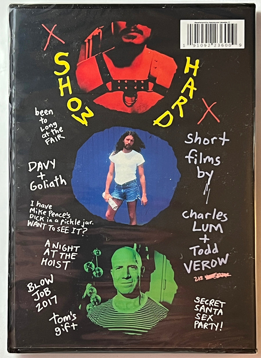 Out of print DVD of SHOW HARD: SHORT FILMS BY CHARLES LUM and TODD VEROW by New Queer Cinema filmmaker Todd Verow. Each signed by the director. SHOW HARD: short films by Charles Lum & Todd Verow Award winning short documentary and narrative films about gay sex and cruising. including: TOM'S GIFT BEEN TOO LONG AT THE FAIR SECRET SANTA SEX PARTY! BLOW JOB 2017 DAVY & GOLIATH I HAVE MIKE PENCE'S DICK IN A PICKLE JAR. WANT TO SEE IT? A NIGHT AT THE HOIST 69 minutes, Not rated contains nudity and graphic sex.