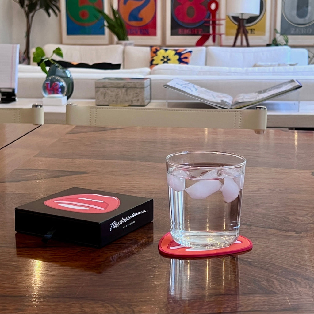 This set of coasters features Tom Wesselmann's iconic Mouth artwork. Constructed of PVC rubber, these coasters have excellent grip and are a protective barrier for any condensation. The box packaging with a sliding drawer is designed with the Mouth against a black background.