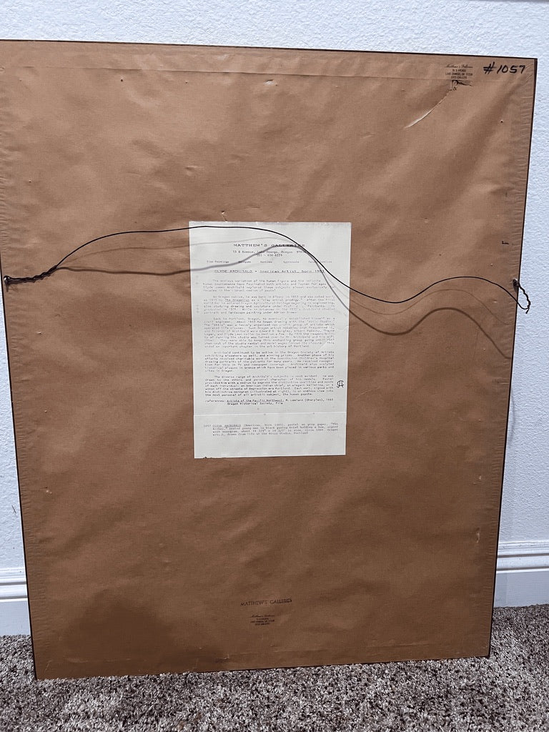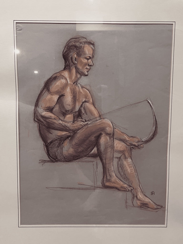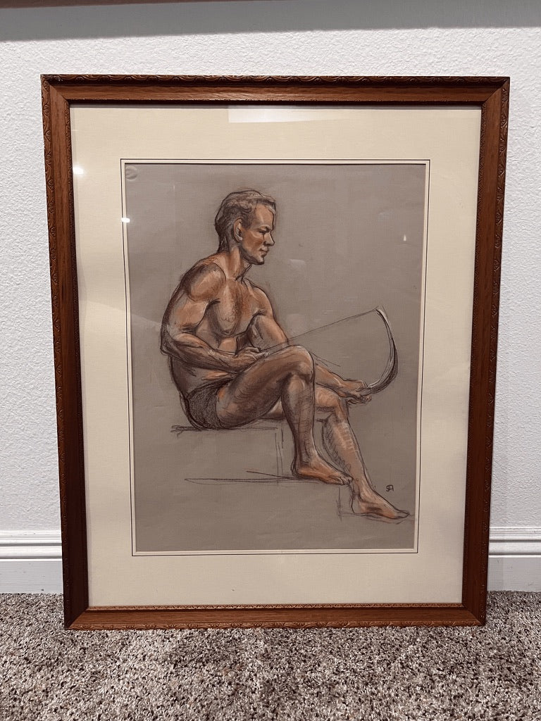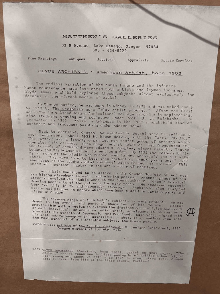 CLYDE ARCHIBALD, American Artist, born 1903. The endless variation of the human figure and the infinite human countenance have fascinated both artists and laymen for ages. Clyde James Archibald explored these subjects almost exclusively for decades in the vibrant medium of pastel. An Oregon native, he was born in Albany in 1903 and was noted early as 1913 by The Oregonian as a “clay artist prodigy.” After the First World War he entered Oregon Agricultural College majoring in engineering, also studying drawing and sculpture under Prof. J. L. Fairbanks. While in Arkansas in the 1930’s Archibald studied portrait and landscape painting under Adrian Brewer. Back to Portland, Oregon, he eventually established himself as a civil engineer. About 1933 he began drawing with the ”Attic studio." The "Attic" was a loosely organized non profit of artists which operated life classes. Such Oregon artist notables that frequented it, and friends of Archibald were Edward S. Quigley, Albert Patecky, Thayne Logan, and Clyde Leon Keller to mention a few. By 1939 the responsibility of running the studio was turned over to Mr. Archibald. They were able to keep this enchanting group going until 1967 when the cost of the studio rental and model wages forced its closure. This ended an important chapter in the art history of Portland. Archibald continued to be active in the Oregon Society of Artists exhibiting elsewhere as well, and winning prizes. He received recognition for this in television and newspaper coverage. Archibald also sculpted historical plaques in bronze which have been placed in various parks and sites in Oregon. Archibald’s most powerful work is found in his portraits of men—images charged with character, intimacy, and quiet allure. His pastel technique brings warmth to skin and complexity to expression, capturing not just bodies, but the magnetism behind them. Signed with his distinctive monogram, each portrait feels like a private moment held still: vulnerable, confident, and unmistakably sensual. For collectors, they offer something rare—male figures portrayed with both strength and desire, created for those who recognise their beauty.