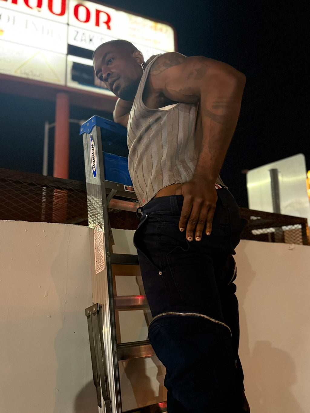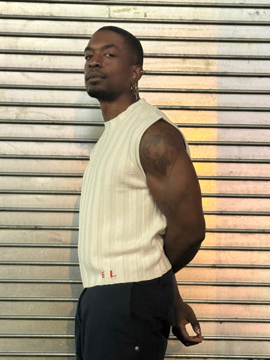 Boxy crewneck vest in 10x10 merino wool rib, featuring a contrast stripe across the body and an intarsia-knit red EL logo.