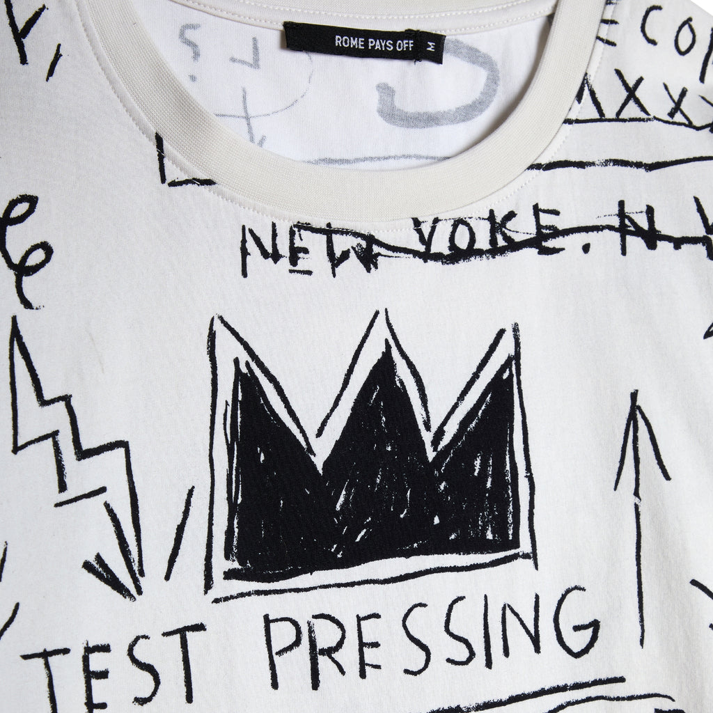 This all-over print medium weight cotton t-shirt features Basquiat's album cover artwork Beat Bop in a new inverted color way. Mirroring the album cover, the t-shirt is printed on the front and the back.