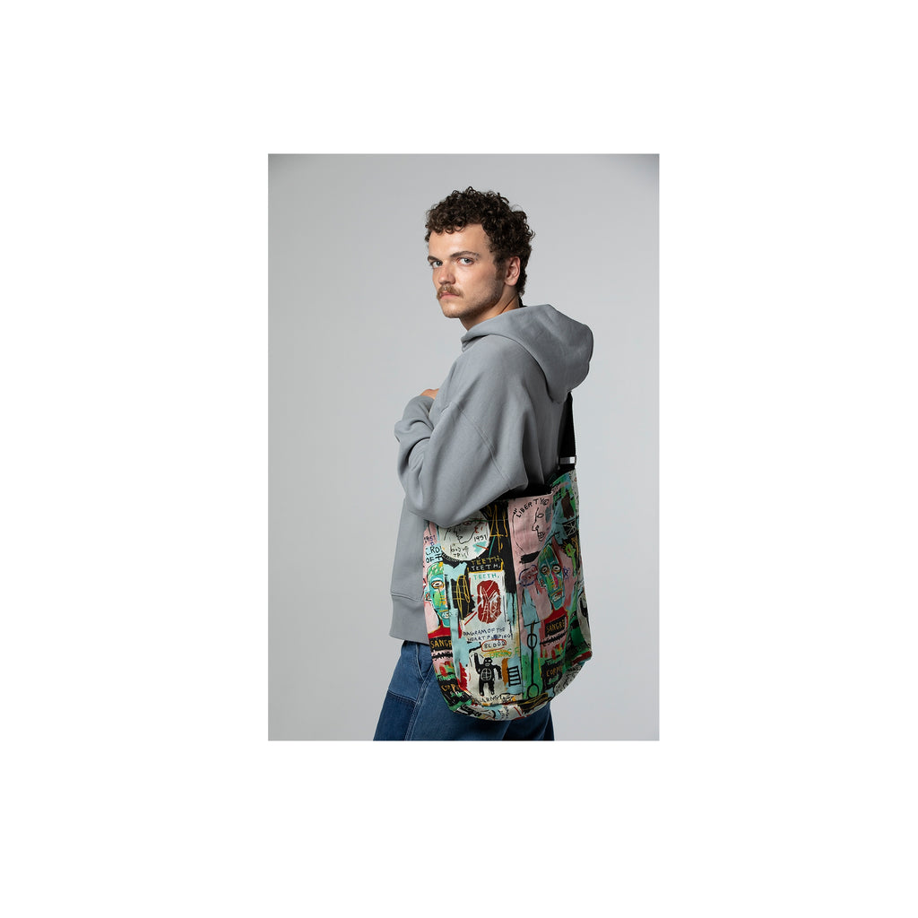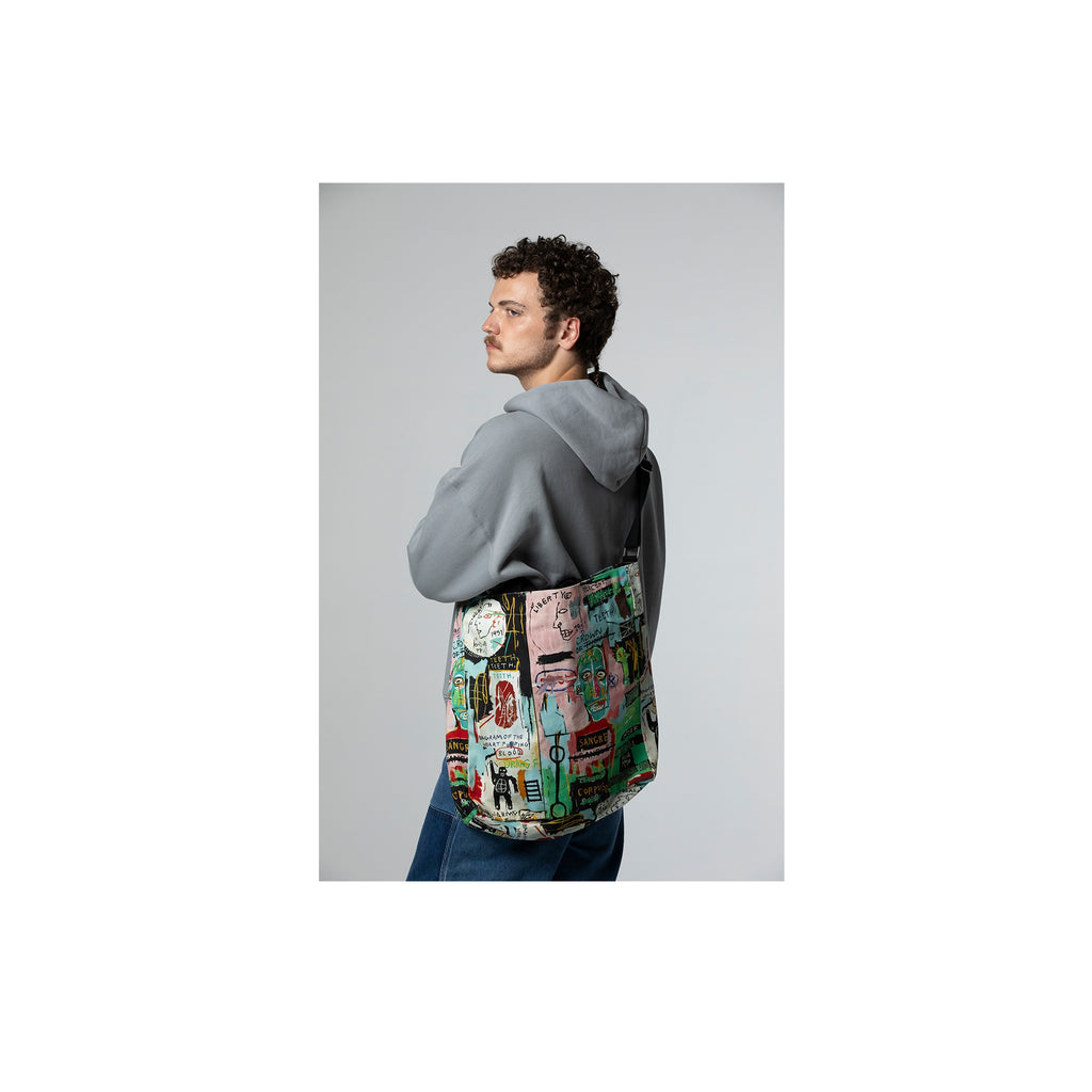 Our canvas bag features a bold, all-over print of Jean-Michel Basquiat's "In Italian". With an adjustable webbed strap as well as hand straps, the oversized bag is incredible functional as well as eye-catching.