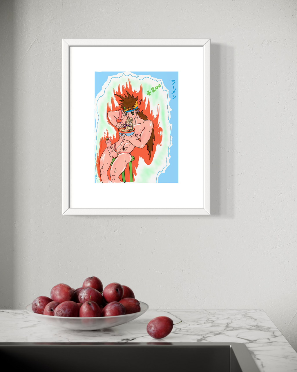 Born in Los Angeles and raised in the San Francisco Bay Area, LA resident 30-year-old Mako Berlin art focuses on sex positivity and the release of shame. Drawing since the age of 3, with a BFA in Graphic Design from Art Center College of Design, he has worked for several years in design and fashion studios, and after assisting and helping with clients and others’ visions has decided to make art under his own name. The art is metaphorically autobiographical; stylistically it is an amalgamation of Eastern and Western influences, having been raised on the west coast by a white father and a Japanese mother and influenced by American and Japanese animation and video games growing up. Employing the tropes and symbols of nostalgia and Americana, old retro gay porn mags and zines, and neon Pantone colors in comic book strips, the drawing combines these styles and adds the influence of Japanese bara manga using surrealism and cartoon-like, exaggerated proportions.