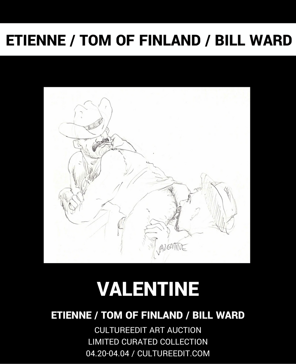 The legacy of Tom of Finland (Touko Laaksonen) continues to resonate powerfully across contemporary art, fashion, and visual culture. Widely recognized for his unapologetic and meticulously rendered depictions of hypermasculine gay figures, Tom of Finland not only redefined queer representation in the 20th century but also laid a bold visual foundation that continues to inspire generations of artists. In this spirit, the inclusion of works by artists such as Etienne and Bill Ward in the CULTUREEDIT auction reflects the enduring reach and evolution of Tom’s visual language. French artist Etienne has acknowledged the aesthetic and political impact of Tom’s imagery in shaping his own explorations of identity and desire. Through stylized photography and carefully staged portraiture, Etienne revisits the codes of leather, uniform, and sculptural masculinity, translating Tom’s graphic vocabulary into a contemporary photographic idiom that blends erotic charge with intimacy and self-aware theatricality. British illustrator Bill Ward represents another important strand within this lineage. Emerging from the world of British comics before turning to gay erotic illustration, Ward became known for narrative drawings that combined the muscular dynamism of adventure comics with unapologetically homoerotic themes. His serialized character Drum, published in magazines such as Drummer, helped define a visual language of rugged masculinity deeply connected to leather and biker subcultures. With bold linework and a strong sense of storytelling, Ward’s work expanded the possibilities of queer erotic comics and circulated within the same underground networks that championed Tom of Finland’s imagery. Presented together in this auction, these artists trace a broader continuum of queer visual culture—from Tom of Finland’s foundational drawings to later interpretations that translate his spirit across media, generations, and cultural contexts. Additional participating artists include Olaf, Valentine, Axel, Alan, Kent and Brick Bradford, whose works further expand this dialogue, highlighting the breadth, humor, and enduring vitality of queer erotic art across multiple voices and perspectives.